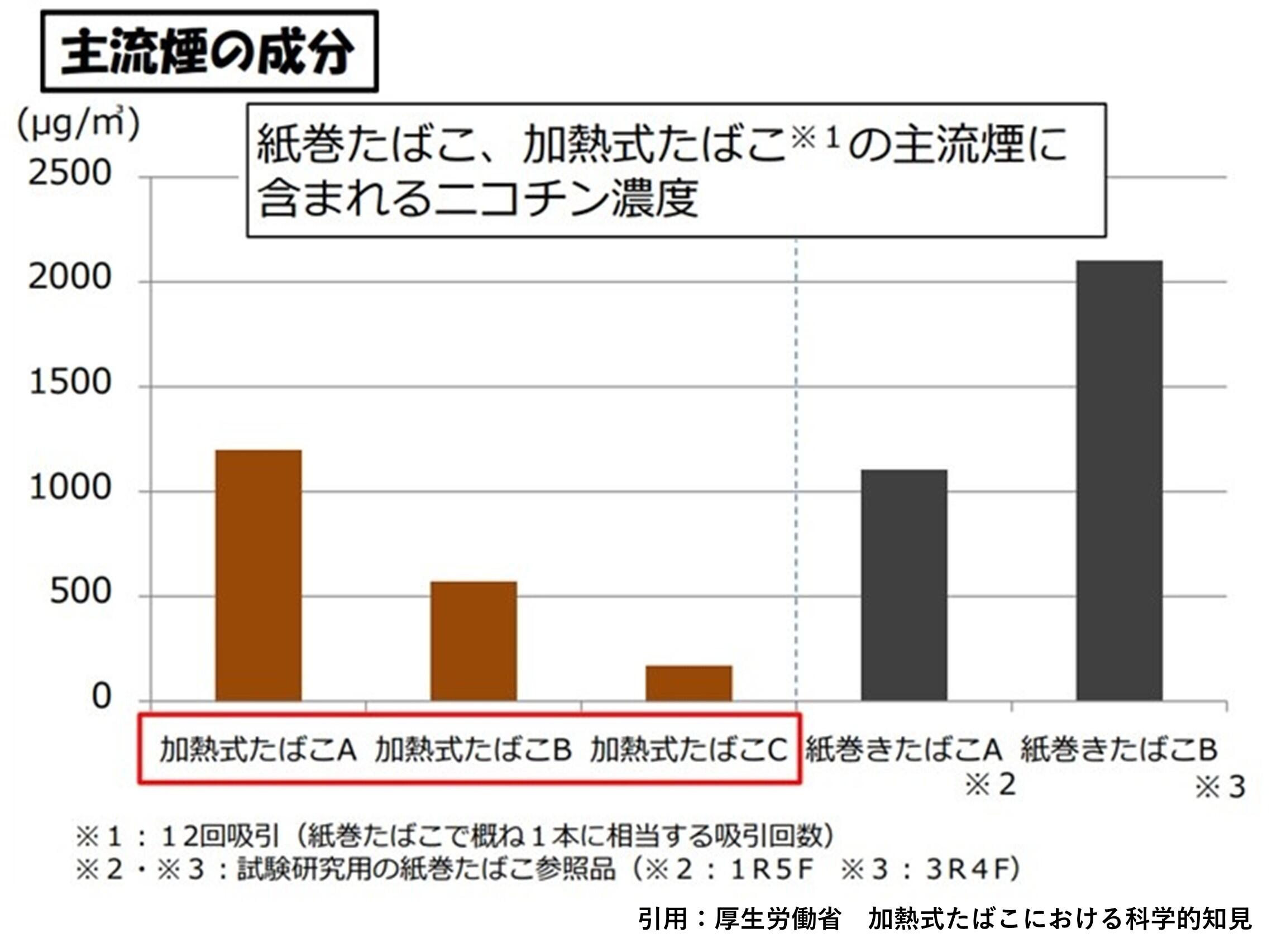 では、加熱式タバコでは病気になるリスクは減らせるのでしょうか?加熱式タバコの主流煙から紙巻きタバコと同程度のニコチンが検出されたとの報告があり(図3)、安全とはいえません。